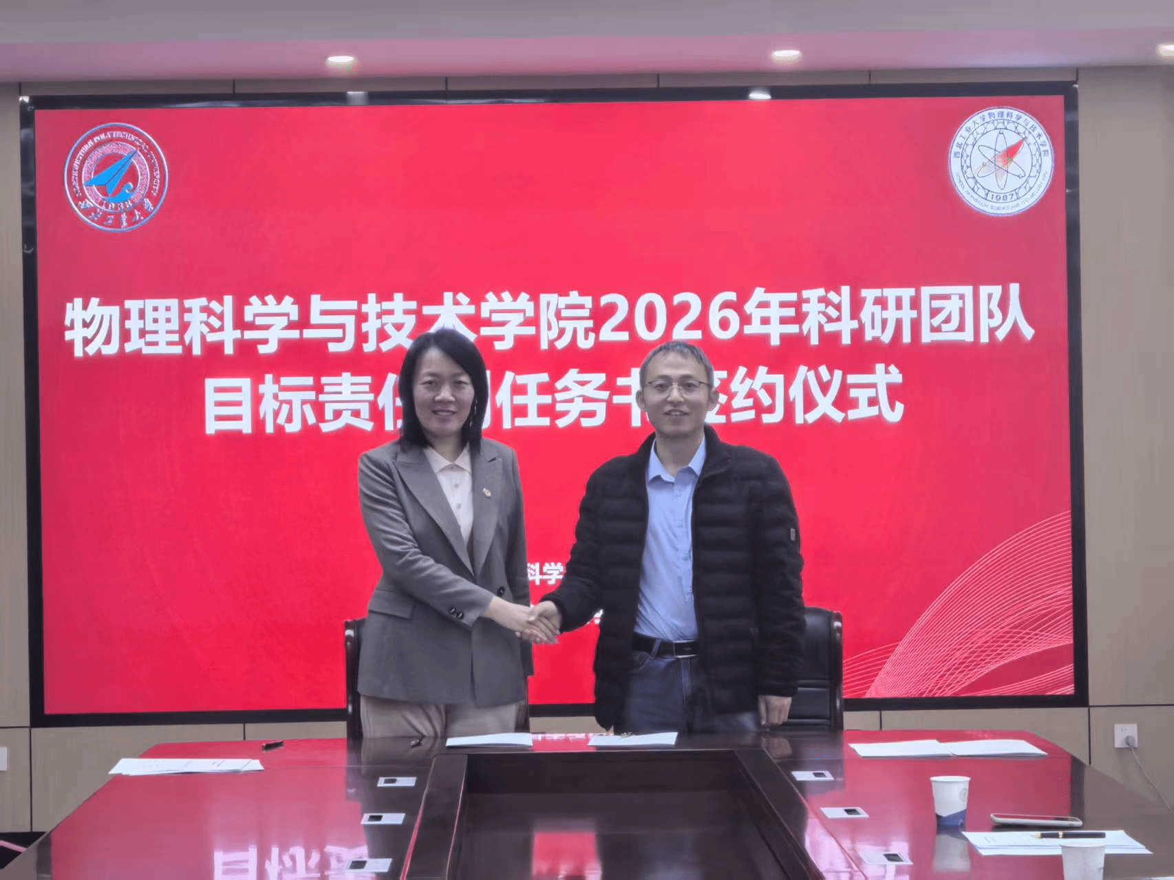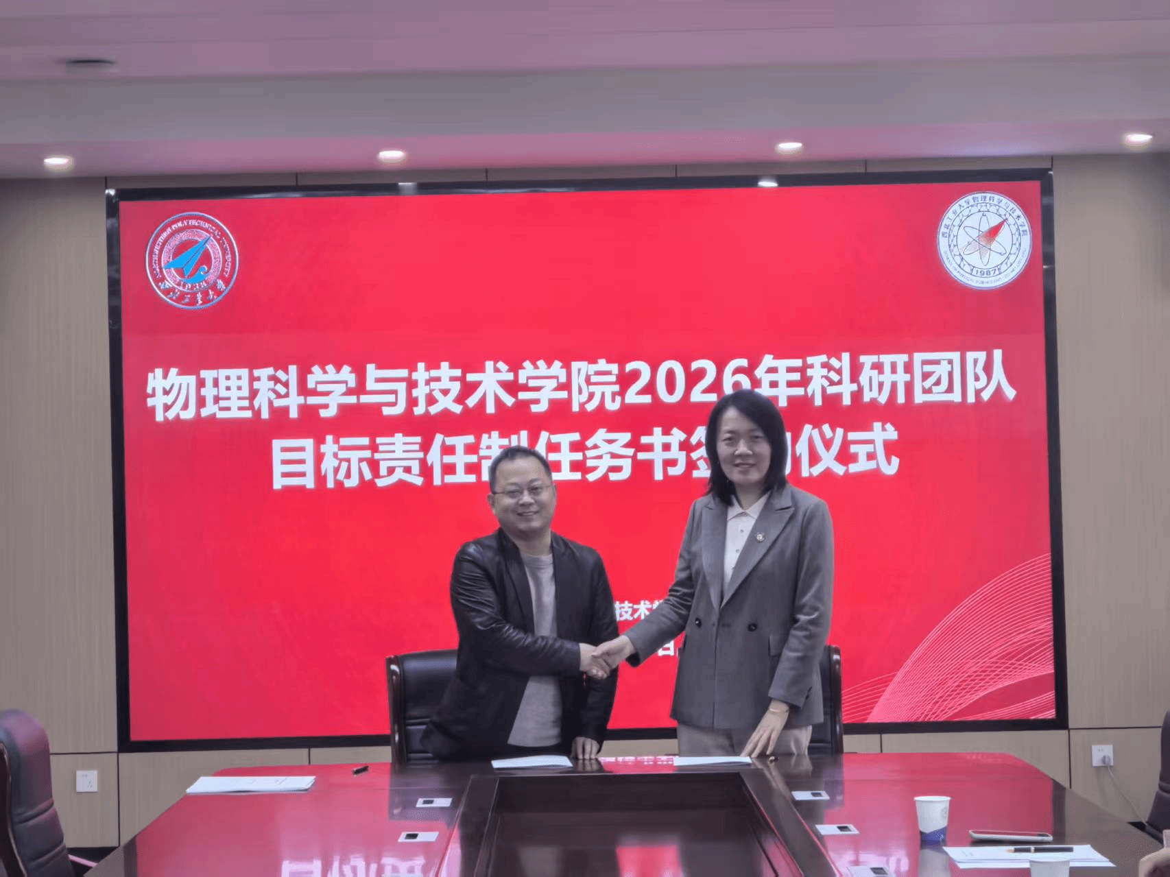 闫娜副院长首先介绍了《西北工业大学物理科学与技术学院科研团队目标责任制管理办法》,对各个团队2026年度的科研和师资队伍建设任务指标进行解读,并代表学院分别与陕西省光信息技术团队、超声科学与技术团队和光基物质科学与超快过程团队负责人现场签订任务书。