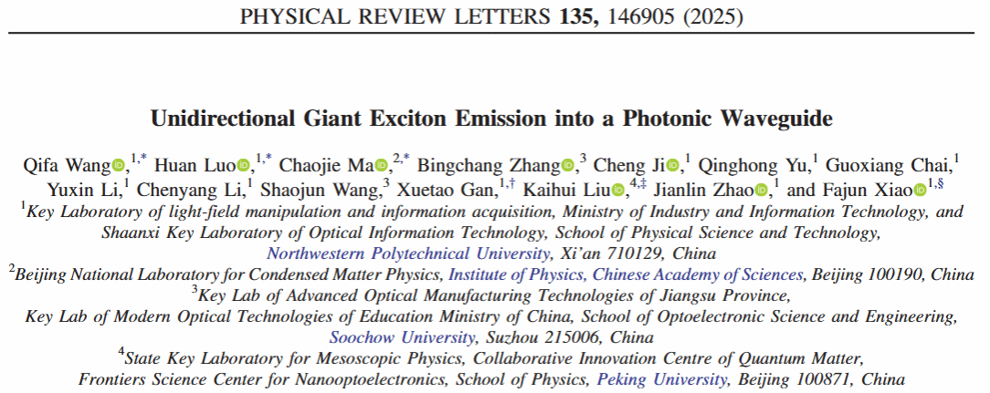 近日,西北工业大学物理科学与技术学院赵建林教授团队联合北京大学刘开辉教授、中国科学院物理研究所马超杰副研究员和苏州大学张丙昌、王绍军教授,在物理学领域顶级期刊《Physical Review Letters》上发表了题为“Unidirectional Giant Exciton Emission into a Photonic Waveguide”的研究论文。物理科学与技术学院研究生王其发、罗焕和中国科学院物理研究所马超杰副研究员为论文共同第一作者,肖发俊教授、甘雪涛教授、刘开辉教授为论文共同通讯作者,赵建林教授对本工作给予了重要指导,西北工业大学物理科学与技术学院为论文第一署名单位。